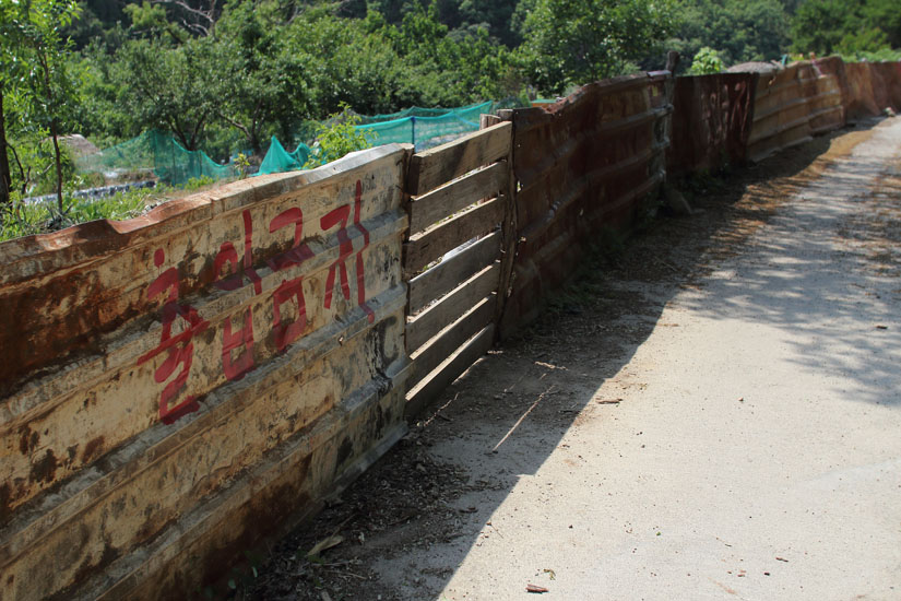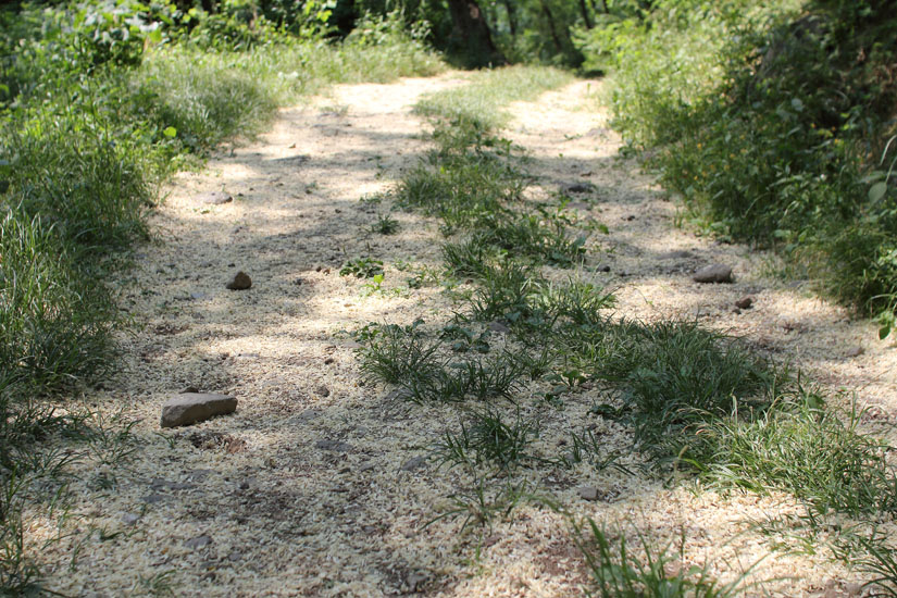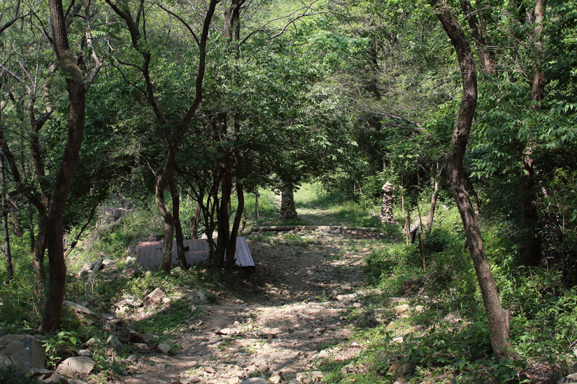 돌탑처럼 쌓아 만들어 놓은 관문을 넘어 계속 내려가니 아카시아 숲이 펼쳐진다. 바닥은 온통 아카시아 꽃잎이 떨어져 마치 새하얀 눈이 내린 것처럼 너무 예쁘다. 아카시아꽃이 다 떨어진 것을 보니 이제 본격적이 여름이 올 모양이다.