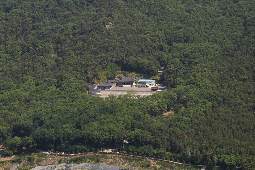 청룡굴을 나와서 좁은 사면을 따라 진행하면 대구보훈병원에서 올라오는 주 등로와 만난다. 이제부터 경사가 조금씩 올라가고, 바위와 돌들도 점점 많아진다. 곧이어 중턱 첫 번째 조망점이 나오는데, 여기서는 월광수변공원에 있는 도원지와 대곡지구 아파트들, 그리고 멀리 성서공단이 내려다보인다. 날씨는 맑은데 미세먼지 때문에 전방 시야가 좋은 않은 점은 아쉽지만 어쨌든 조망은 좋다.