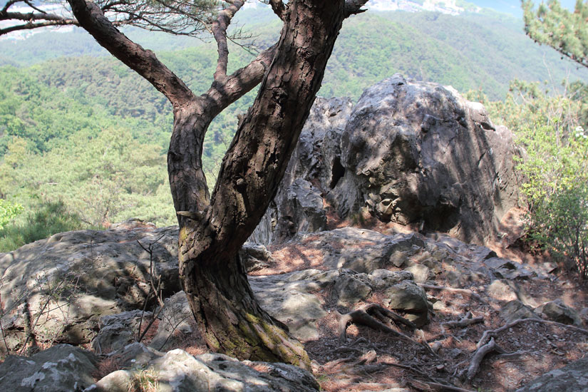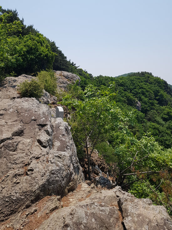 또 하나의 조망점이라 할 수 있는 배바위라는 뜻의 배방우가 나오는데 시간이 갈수록 하늘은 점점 더 뿌예져 전방 시계가 좋지 못하다. 전해오는 전설에 의하면 여기에 비가 많이 와서 이 바위에 배를 매어놓고 마을과 산이 물에 잠기는 것을 대비했다고 하여 배바위가 되었다고 한다. 왠지 성서의 노아의 방주가 생각나는데, 언제 누가 이런 말을 지어낸 것인지가 더 궁금하다.